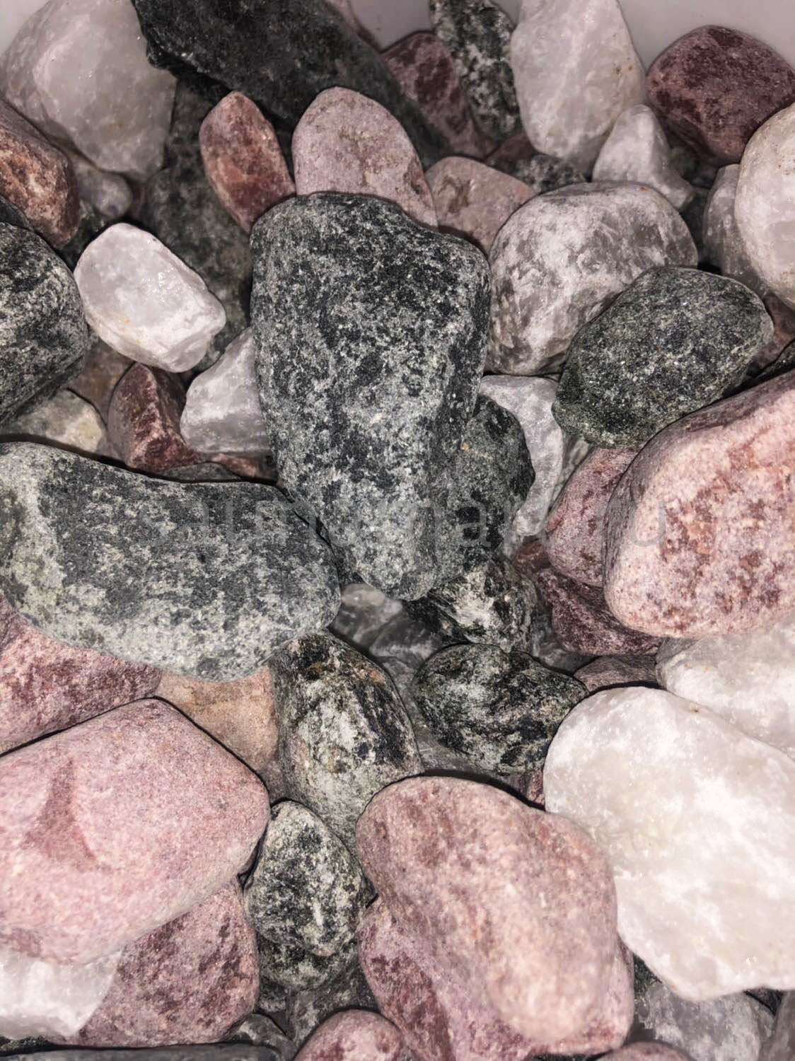 Микс камней для бань и саун состоит из разных видов камней: кварцит белый и малиновый, габбро-диабаз и порфирит.