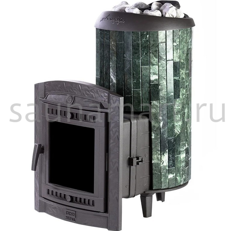 Модель с увеличенной каменкой и повышенной производительностью. Ламели из змеевика по периметру внешней каменки не только обладают хорошими теплонакопительными свойствами, но и придают печи оригинальный внешний вид.