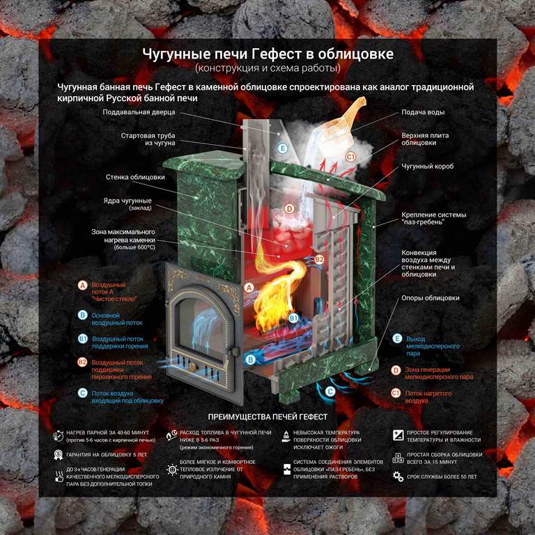 Печка Гефест Ураган может быть модернизирована до полноценной печи для русской парной. Для этого кованная сетка заменяется на каменную облицовку без необходимости разборки отопителя.