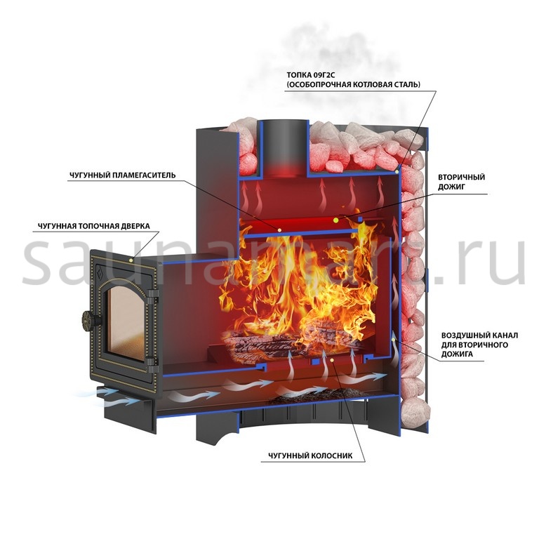 Воздух в зону горения подаётся через поддувало, его количество регулируется зольным ящиком совкового типа. Открытый зольник усиливает горение, закрытый – замедляет его. Чугунный пламегаситель перенаправляет поток горячего воздуха и дымовых газов к задней части топки. Это позволяет снять с печи максимум энергии в единицу времени. Чугунная дверь при нагревании не деформируется, сохраняет свою форму при остывании и предотвращает попадание продуктов горения на пол перед топкой. Печи Везувий СКИФ оснащаются сетками для камней. Сетки могут быть сделаны из металлического прутка или кованой стальной ленты шириной 40 мм. В сетки по всей высоте укладываются камни для бани, обеспечивая большой объём заклада и длительное удержание тепла после прогрева каменки.