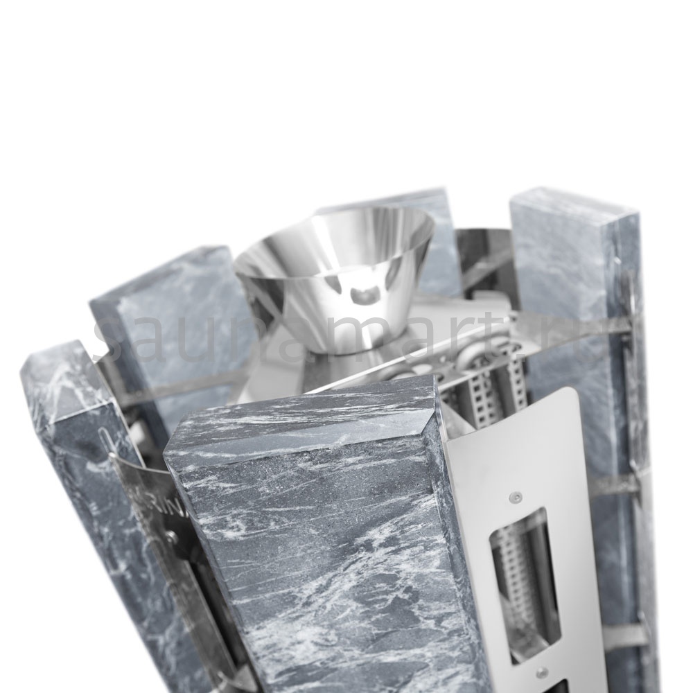 - Закрытая каменка: Выше парогенератора имеется емкость под мелкие камни или нержавеющие шары объемом 2.5 л, вмещающая 5 кг мелкого камня, называемая закрытой каменкой с воронкой для подачи воды и получения мелкодисперсного пара.