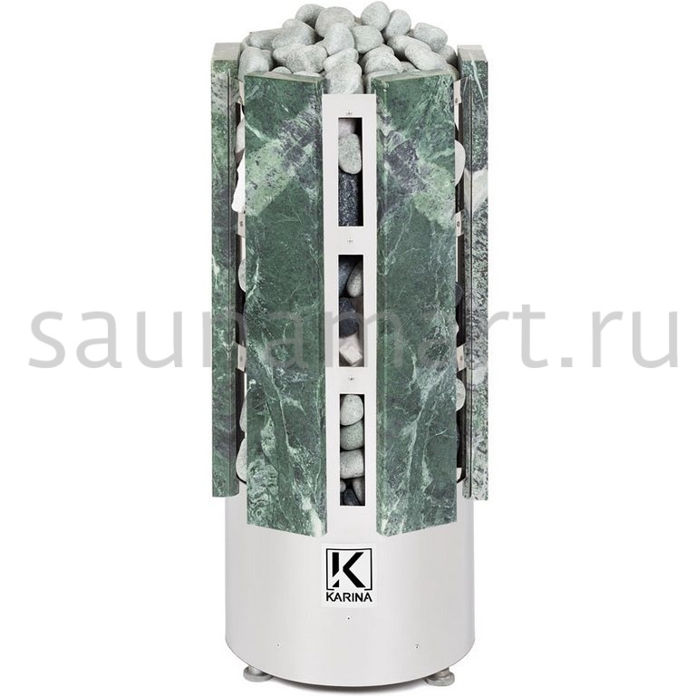 Электрокаменка Karina Forta 12 Змеевик предназначена для использования в парных объемом до 16 м?. Печь выполнена в напольном варианте и обладает цилиндрической формой, дополненной плитами из натурального камня Змеевика.