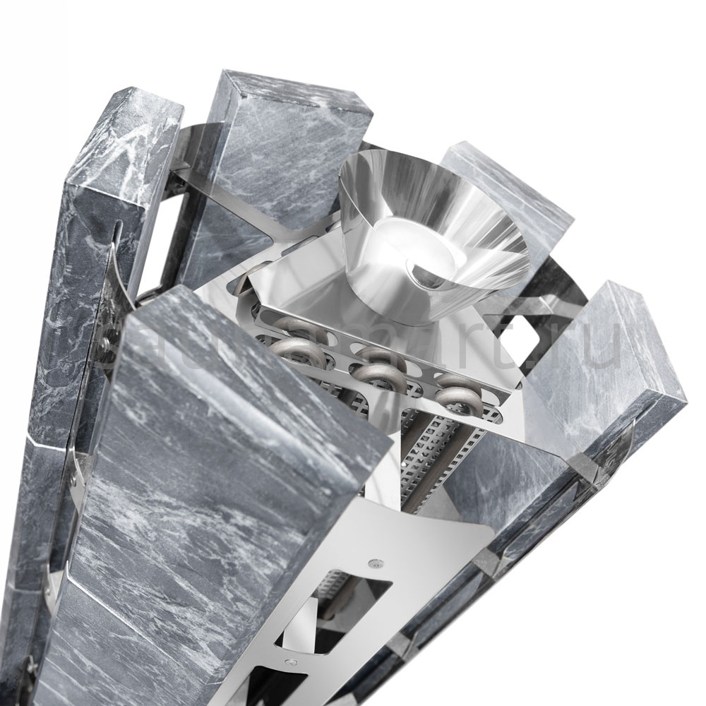 - Закрытая каменка: Выше парогенератора имеется емкость под мелкие камни или нержавеющие шары объемом 4.7 л, вмещающая 10 кг мелкого камня, называемая закрытой каменкой с воронкой для подачи воды и получения мелкодисперсного пара.