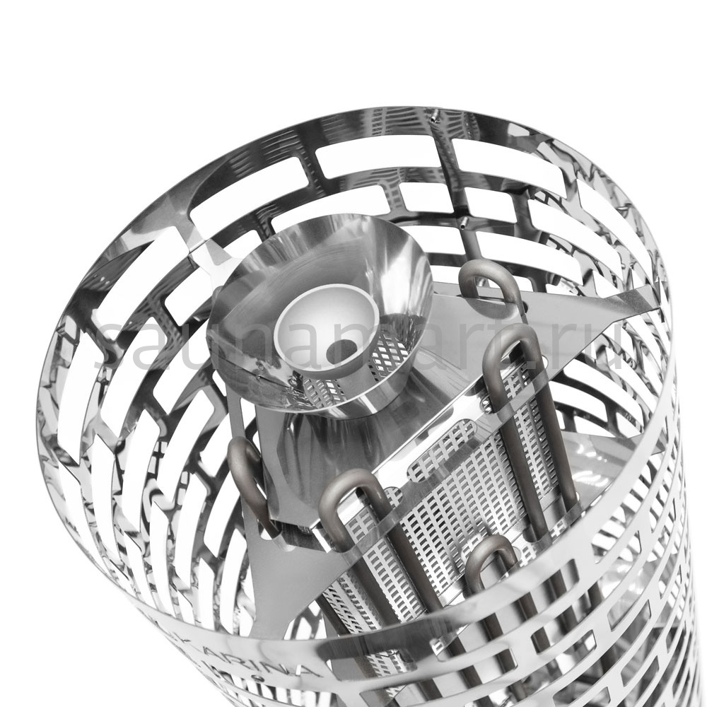 Электрокаменка Karina Nova 15E предназначена для использования в парных объемом до 24м3. Печь выполнена в напольном варианте, цилиндрической формы. Напряжение питания – 380В. Данная модель укомплектована 9 ТЭНами, расположенными в виде треугольника. Внизу каменки находится бак для воды емкостью 4.2 л, который является парогенератором. Выше парогенератора расположена емкость под мелкие камни или нержавеющие шары объемом 5 л, вмещающая 10 кг мелкого камня, называемая закрытой каменкой с воронкой для подачи воды и получения мелкодисперсного пара. Электрокаменка Karina Nova 15E многофункциональна, и при правильной эксплуатации она подойдет для любителей как финской сауны, так и русской бани.