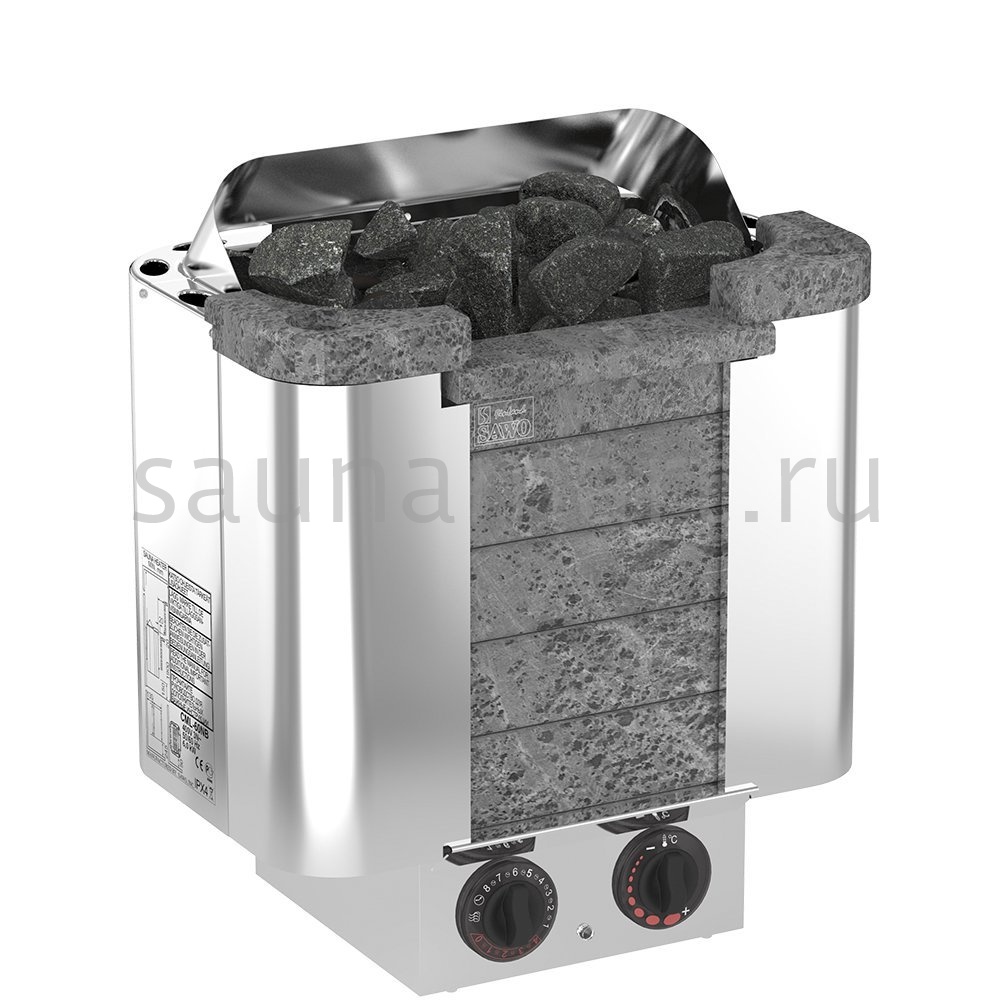 SAWO Электрическая печь CUMULUS CML-80NB-P Электрокаменка Sawo Cumulus вместимостью до 25 кг камней. Дополнительные кубы мыльного камня могут быть добавлены в каменку по желанию. Каменка со вставками из талькохлорита спереди и оригинальной подсветкой. Встроенный блок управления.