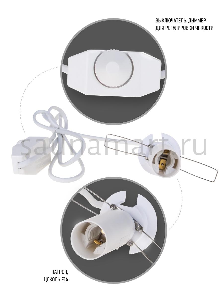Изделие представляет собой: сетевой шнур двухжильный длиной 150 см белого цвета; плоская литая сетевая вилка стандарта евро; патрон с металлическими усиками для крепления и цоколем Е14; диммер, включающий и выключающий электроприбор с возможностью плавного регулирования яркости освещения.