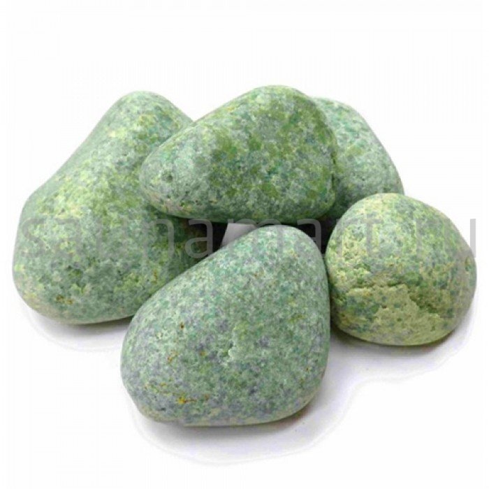 Камень жадеит шлифованный крупный фракции 100-150 мм — элитный наполнитель для банных печей. Упаковка: ведро 20 кг с сертификатом качества.