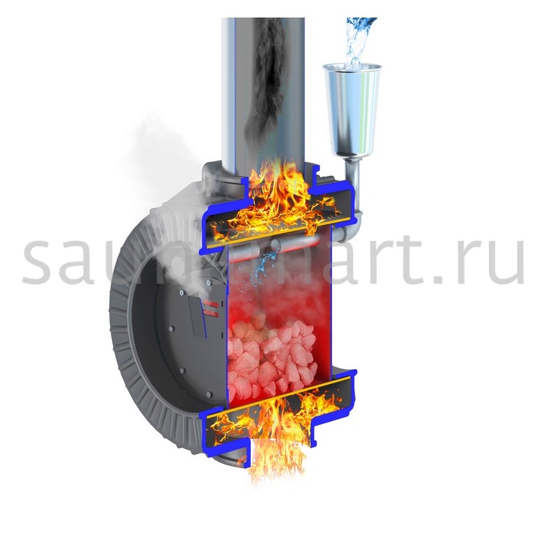 Турбопар Шторм от Везувий — натрубная каменка из чугуна, заменяющая стартовый участок дымохода. Эффективно передает тепло от дымовых газов в парную, увеличивая КПД печи. Вмещает до 20 кг камней для создания дополнительного теплового контура.